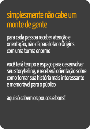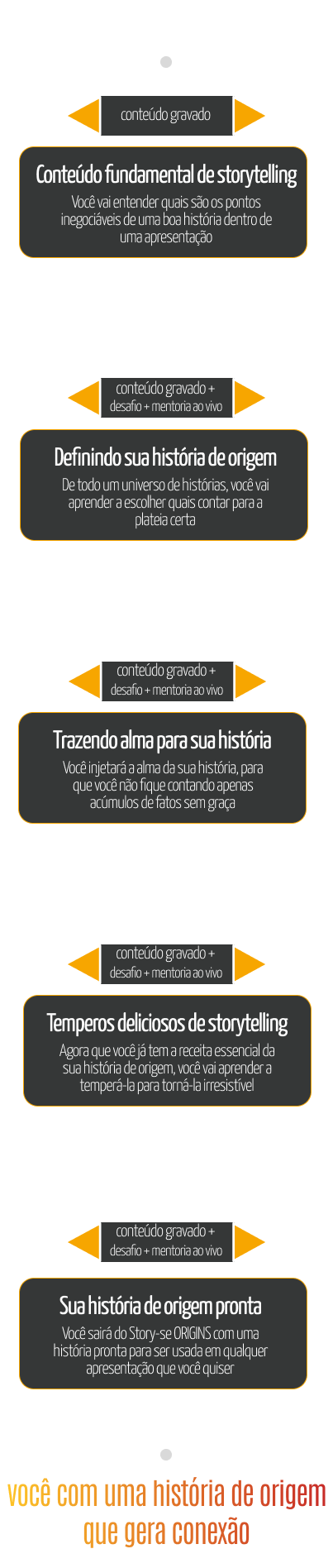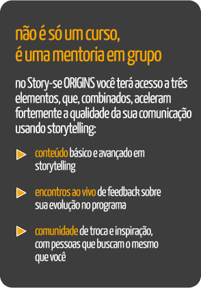 Story-se é um curso. Excelente, modéstia à parte. Você faz sozinho, no seu ritmo e aplica os ensinamentos conforme sua própria disciplina. Já o Origins é uma mentoria em grupo. Isso quer dizer que além de um conteúdo prático e leve, você também terá desafios, interação com a comunidade e encontros ao vivo para receber feedback sobre o seu desenvolvimento.